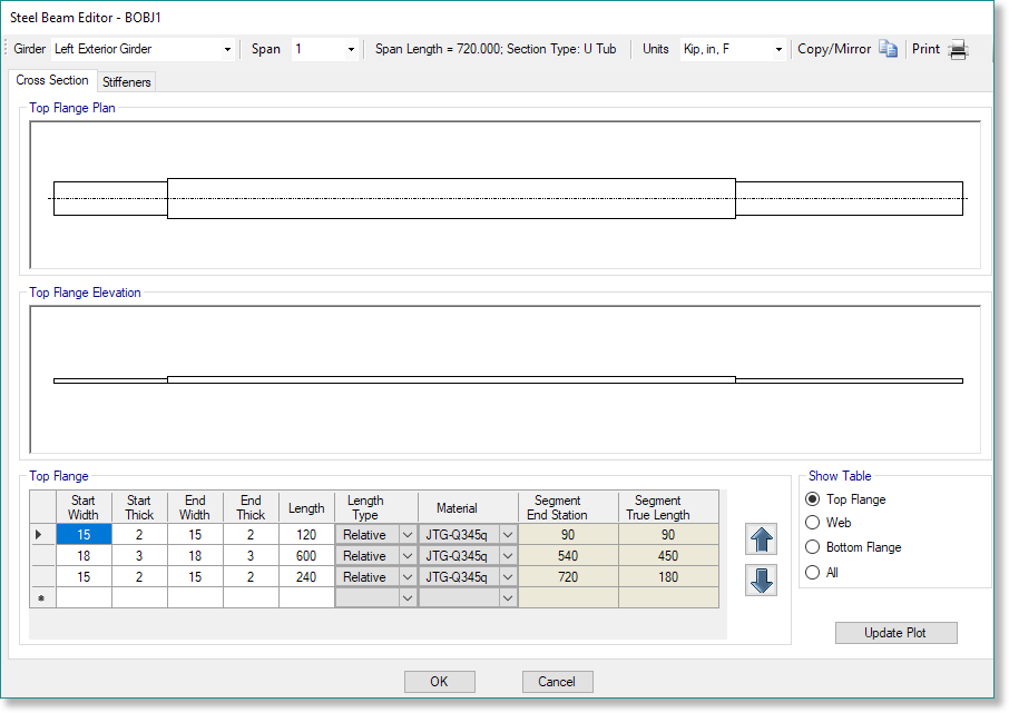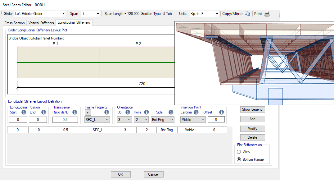 - 現(xiàn)在可以在鋼梁編輯器中為U型鋼梁橋指定底翼緣縱向加勁筋,在上部結(jié)構(gòu)強度設計和評估中程序會考慮這些加勁筋的作用。布局選項可調(diào)整底翼緣加勁的縱向起始和結(jié)束位置、橫向比例、方向以及插入點位置
