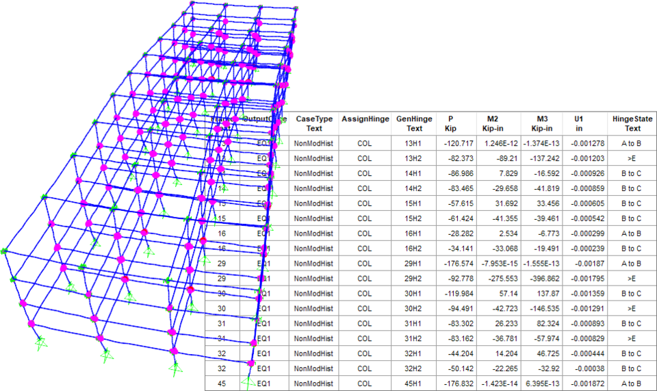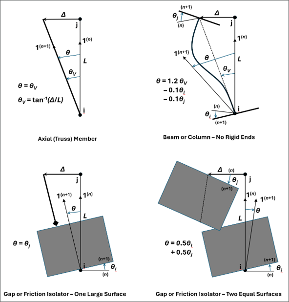 在考慮大位移效應的計算模型中,程序可以通過連接屬性中的P-Delta參數(shù)控制連接單元的局部軸旋轉(zhuǎn)。該功能適用于幾何非線性選項為“P-Delta和大位移”的非線性靜力分析、非線性直接積分法的時程分析以及階段施工分析。