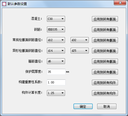 默認(rèn)參數(shù)設(shè)置可以為所有截面/構(gòu)件設(shè)置默認(rèn)參數(shù),如混凝土等級(jí)、鋼筋型號(hào)、鋼筋直徑、保護(hù)層厚度等。另外,用戶也可以根據(jù)需要修改單個(gè)構(gòu)件的參數(shù)值。