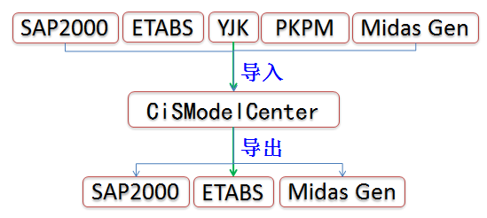 CiSModelCenter旨在幫助用戶實現(xiàn)不同軟件間的數(shù)據(jù)轉(zhuǎn)換,最大程度減少重復(fù)工作,提高工作效率。目前,CiSModelCenter轉(zhuǎn)換工具涵蓋國內(nèi)主流結(jié)構(gòu)設(shè)計軟件,支持導(dǎo)入的數(shù)據(jù)格式有SAP2000中文版、ETABS中文版、PKPM、YJK和Midas Gen,支持導(dǎo)出的數(shù)據(jù)格式有SAP2000中文版、ETABS中文版和Midas Gen。CiSModelCenter可以在支持的數(shù)據(jù)格式中相互轉(zhuǎn)換,如下圖所示: