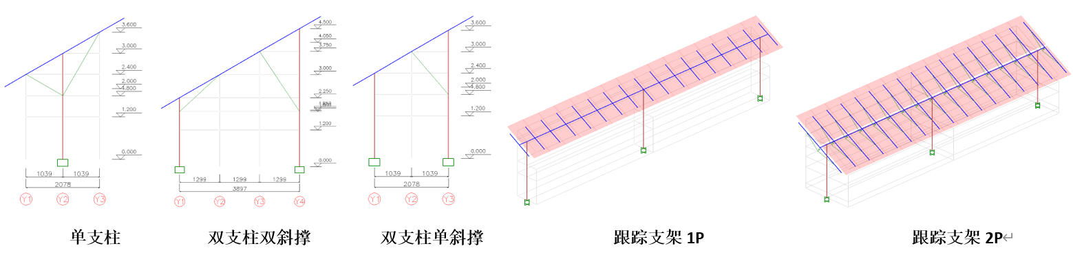 光伏支架有固定式光伏、跟蹤式光伏、柔性光伏支架等多種形式,其中固定式光伏支架和跟蹤式光伏支架形式固定,可以通過(guò)參數(shù)化方式建模。光伏支架結(jié)構(gòu)中的構(gòu)件有鋼構(gòu)件和冷彎薄壁構(gòu)件兩種類型,在PV_SAP中支持多種類型截面的定義。整個(gè)建模過(guò)程中也做了一些自動(dòng)化處理,提升建模效率。