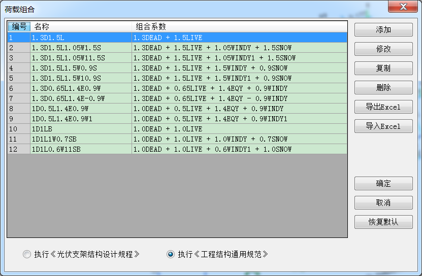 在建模過(guò)程中做了自動(dòng)化處理,如桿件端部約束關(guān)系的指定、荷載組合自動(dòng)生成、荷載自動(dòng)計(jì)算等,同時(shí)也提供編輯窗口可以對(duì)其進(jìn)行編輯。荷載組合根據(jù)規(guī)范自動(dòng)生成,集成了新舊版本的規(guī)范。荷載組合支持編輯,可以在軟件中直接編輯,也可以導(dǎo)出為Excel文件進(jìn)行編輯。