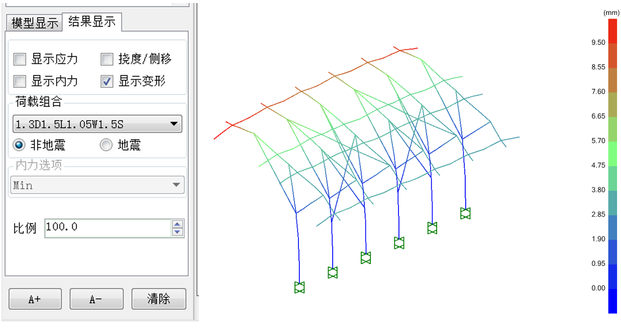 變形結(jié)果顯示光伏支架結(jié)構(gòu)變形圖,選擇某個(gè)荷載組合,顯示光伏支架的整體變形。