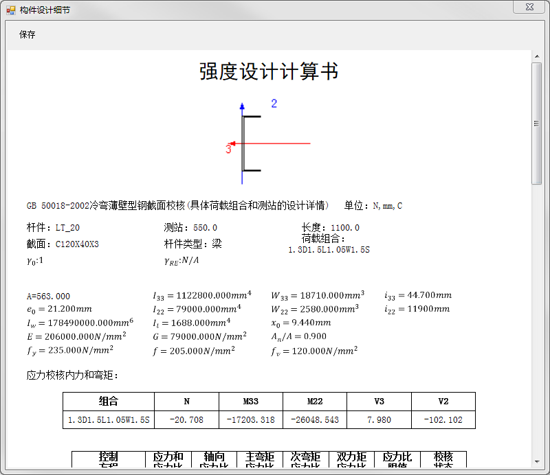 冷彎構(gòu)件的設(shè)計(jì)在PV_SAP中完成,顯示結(jié)果可以顯示應(yīng)力比,也可以顯示冷彎構(gòu)件的設(shè)計(jì)過(guò)程。使用冷彎設(shè)計(jì)細(xì)節(jié)功能,可以查看單構(gòu)件在所有荷載情況下的強(qiáng)度設(shè)計(jì)結(jié)果和穩(wěn)定設(shè)計(jì)結(jié)果(圖12)。單擊設(shè)計(jì)過(guò)程,可以查看設(shè)計(jì)過(guò)程中使用的各項(xiàng)參數(shù)(圖13)。
