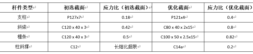 以某單支柱光伏支架為例,初選截面和優(yōu)化后的截面及相應(yīng)應(yīng)力比如下表。從表中可知:當(dāng)初選截面偏大時(shí),優(yōu)化后的截面會(huì)減小;反之則會(huì)增大;程序最終選到滿足要求的最小截面為止。下表中的斜梁和檁條,初選截面偏大,經(jīng)過(guò)優(yōu)化后,得到應(yīng)力比為0.8的優(yōu)化截面。對(duì)于下表中的柱斜撐,初選截面為C12,長(zhǎng)細(xì)比不滿足限值要求,優(yōu)化后程序按照最小長(zhǎng)細(xì)比限值要求(1/120)確定合理截面C14a。對(duì)于下表中的支柱,初選截面為P127x7,計(jì)算后發(fā)現(xiàn)其受力較小,為長(zhǎng)細(xì)比控制;程序最終優(yōu)化的截面也是滿足長(zhǎng)細(xì)比要求限值(1/150)的截面P121x4。