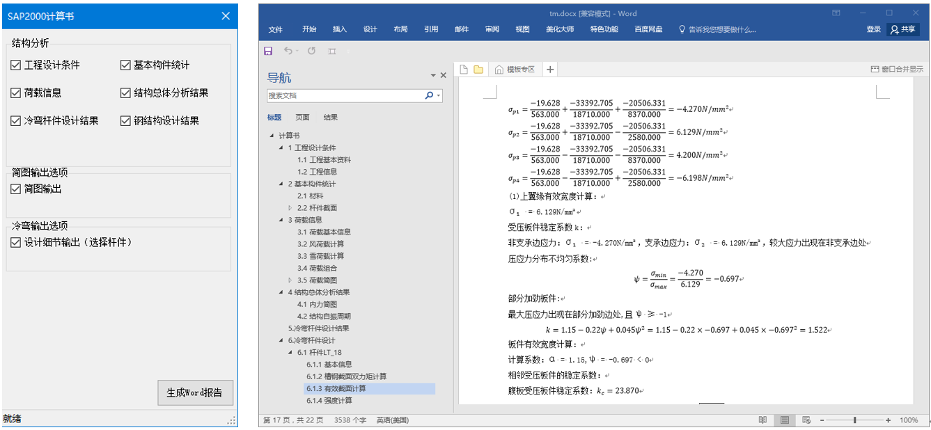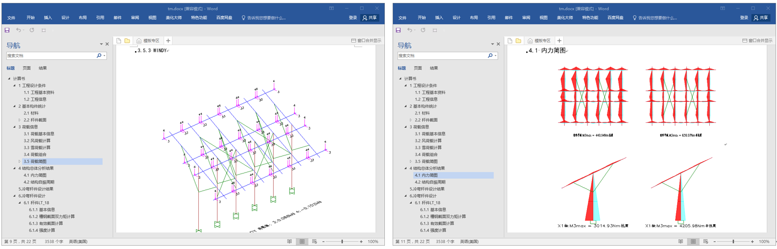 計(jì)算書部分可以設(shè)置輸出的計(jì)算內(nèi)容,在輸出冷彎構(gòu)件的設(shè)計(jì)結(jié)果時(shí),可以按照表格方式輸出,也支持設(shè)計(jì)過(guò)程輸出。如圖15所示。在計(jì)算書中,也輸出了荷載簡(jiǎn)圖和內(nèi)力簡(jiǎn)圖。