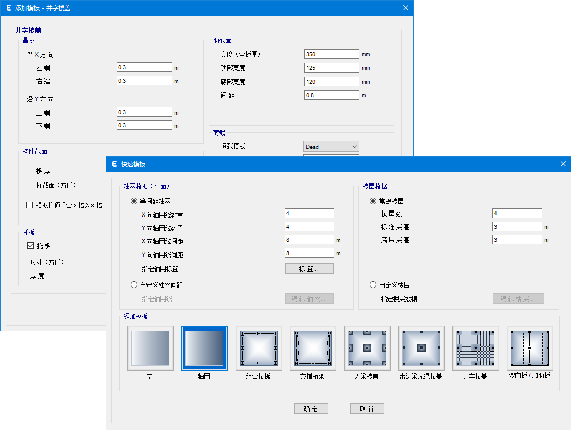 ETABS中文版有多種模板可供用戶選擇以快速開(kāi)始新模型。在定義快速模板階段,用戶可以定義軸網(wǎng)和軸網(wǎng)間距、樓層數(shù)、默認(rèn)結(jié)構(gòu)系統(tǒng)截面、默認(rèn)樓板和托板截面以及均布荷載(恒載和活載)。