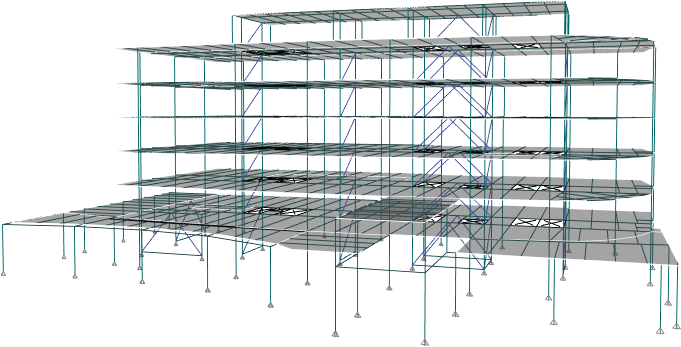 分析模型顯示結(jié)構(gòu)的有限元模型,該模型由節(jié)點(diǎn)、框架單元、殼單元以及定義的網(wǎng)格劃分組成。運(yùn)行分析時(shí),程序根據(jù)對(duì)象模型以及屬性指定和設(shè)置自動(dòng)生成分析模型。