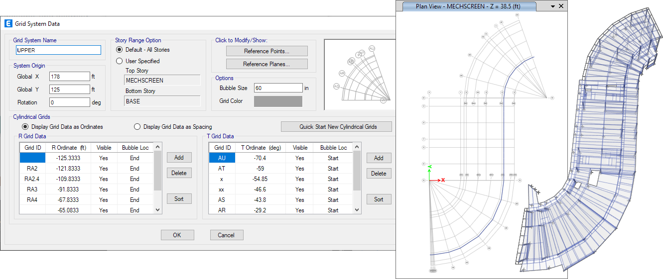 在ETABS中文版中,軸網(wǎng)系統(tǒng)包括笛卡爾、圓柱或一般軸網(wǎng)系統(tǒng)。模型中的軸網(wǎng)系統(tǒng)數(shù)量沒(méi)有限制,每個(gè)軸網(wǎng)系統(tǒng)可以具有自己獨(dú)立的原點(diǎn)和轉(zhuǎn)角。