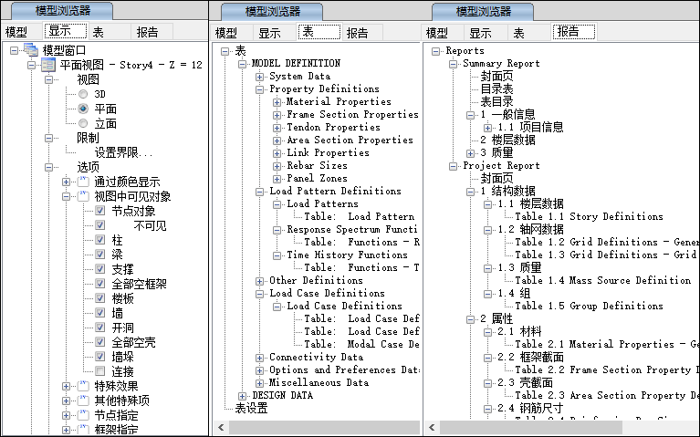 模型瀏覽器允許用戶輕松訪問(wèn)模型定義數(shù)據(jù),包括屬性、荷載和結(jié)構(gòu)對(duì)象,也包括分析和設(shè)計(jì)結(jié)果,它們以圖形、表格和報(bào)告的格式呈現(xiàn)。