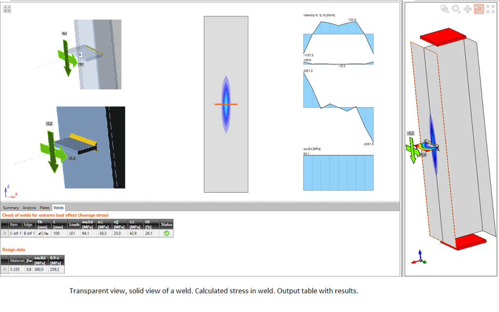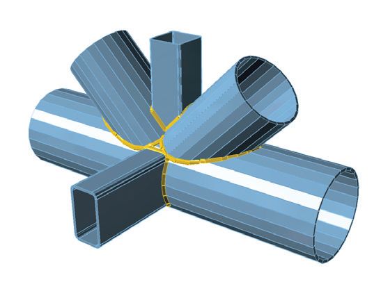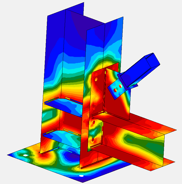 焊縫通過板件間的約束進行模擬,同時計算每一條焊縫中的內(nèi)力,并根據(jù)各國設(shè)計規(guī)范(包括中國)校核焊縫中的應(yīng)力。