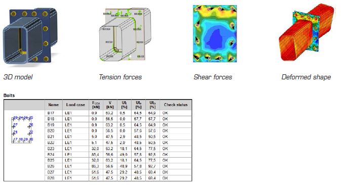 IDEA 可用于設(shè)計各種類型的焊縫或螺栓連接的節(jié)點、底板、柱腳以及錨栓。該軟件既可以輸出詳盡的整體校核和強度校核結(jié)果,也可以進行鋼節(jié)點的剛度和屈曲分析。除此之外,該軟件還可以基于歐標 EN、美標 AISC、加拿大規(guī)范 CISC、澳大利亞規(guī)范 AS、俄羅斯規(guī)范 SP 以及國標 GB 校核螺栓、焊縫以及混凝土底座。對于頻繁使用的節(jié)點形式、常見的型鋼截面和組合截面,IDEA 同樣提供了靈活豐富的模板庫供用戶選擇。
