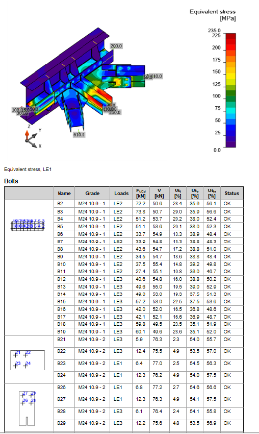 用戶可以選擇三種類型的輸出包括,即:單行報告、單頁報告和詳盡報告。該輸出報告中包含基于各國設(shè)計規(guī)范(包括中國)的全部鋼節(jié)點校核結(jié)果。