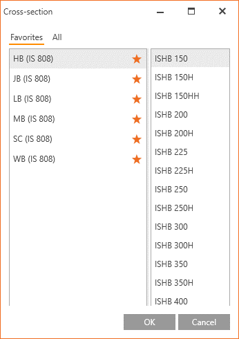 目前,IDEA v20型鋼截面庫包括8個國家超過1000多種常見截面,用戶可根據(jù)需要任意選用。為了便于快速定位常見截面,用戶可將部分系列的截面以“☆”標識。