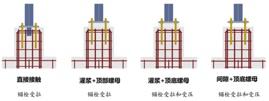 采用柱底灌漿時可選擇只在底板的頂部安裝螺栓,或頂部和底部同時安裝。對于前者,錨栓只能受拉;對于后者,錨栓可以受拉或受壓。