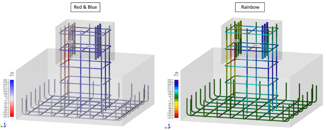 鋼筋校核結(jié)果的云圖顯示可選用彩色或紅藍色,紅藍色適用于區(qū)分鋼筋的受拉和受壓狀態(tài)。
