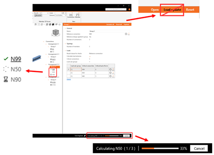 新增的批量化計算進度條可以實時顯示計算進度,用戶可根據(jù)需要臨時【取消】計算。Checkbot在同步上下游軟件的同時,可以自動更新荷載數(shù)據(jù),無需用戶手動更新。