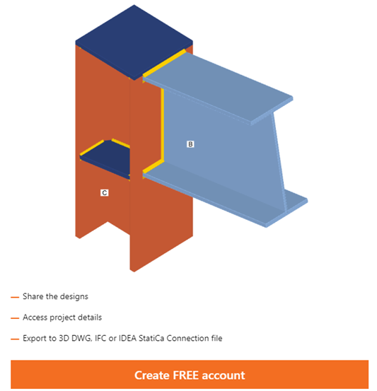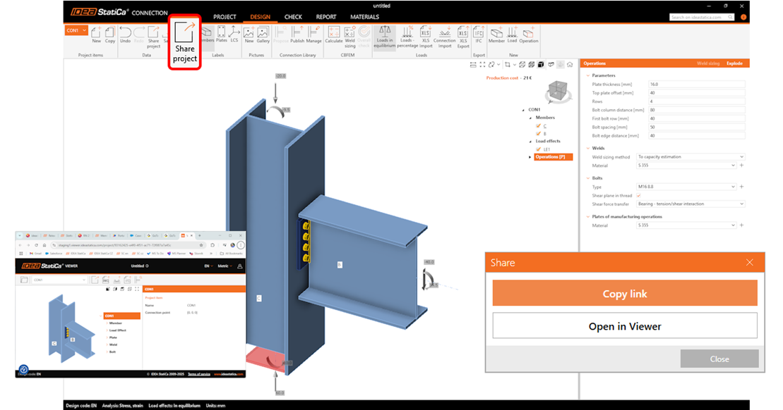 IDEA StatiCa 網(wǎng)頁端 Viewer 功能得到進一步增強,用戶不僅可以查看鋼結(jié)構(gòu)節(jié)點的設(shè)計方案,還可以根據(jù)需要分享模型鏈接或?qū)С?DWG 和 IFC 格式的模型文件。