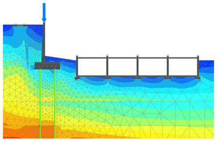說明結構和土相互作用的一個很好的例子是岸墻設計。開挖擋土結構采用地下連續(xù)墻,支撐采用預應力錨桿。在二維模型中錨桿用點對點錨桿和嵌固排樁模擬??觾韧馏w開挖,下覆土的行為可以用HS模型很好的模擬。HS模型考慮了模量和應力相關性。并且,小應變硬化土模型HSsmall能夠考慮在小應變條件下土的剛度增加特性。