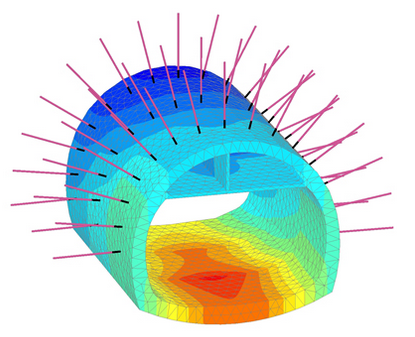 在PLAXIS 2D和3D中的隧道設(shè)計器可以使用板單元或者實體單元快速地模擬噴射混凝土襯砌或者鉆挖隧道。并且可以模擬錨桿,注漿壓力,千斤頂推力,隧道掌子面壓力以及體積損失。嚴(yán)格意義上說,隧道開挖是三維問題。但是對于符合平面應(yīng)變條件時,隧道掘進(jìn)和掌子面應(yīng)力釋放問題使用收斂-約束法也可以用PLAXIS 2D考慮。另外,對于支護(hù)的設(shè)計和支護(hù)安裝位置的確定應(yīng)該使用PLAXIS 3D。噴射混凝土模型可以考慮混凝土強度和剛度隨時間變化,以及混凝土的收縮和蠕變。除此之外,還能夠模擬加固隧道的錨桿。PLAXIS能夠準(zhǔn)確地預(yù)測淺埋和深埋隧道開挖過沖中對周邊土層或巖體的響應(yīng)。