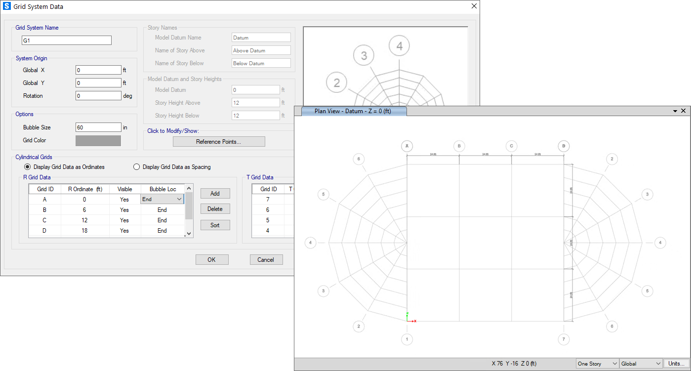 在SAFE中文版中,軸網(wǎng)系統(tǒng)包括笛卡爾、圓柱或一般軸網(wǎng)系統(tǒng)。模型中的軸網(wǎng)系統(tǒng)數(shù)量沒有限制,每個軸網(wǎng)系統(tǒng)可以具有自己獨立的原點和轉角。