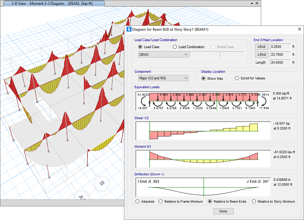 在2D和3D視圖中顯示單一荷載工況或荷載組合下梁或板帶上的軸力、剪力、彎矩、扭矩和應(yīng)力圖。最小值和最大值將自動(dòng)顯示。可以顯示任意構(gòu)件的內(nèi)力圖。