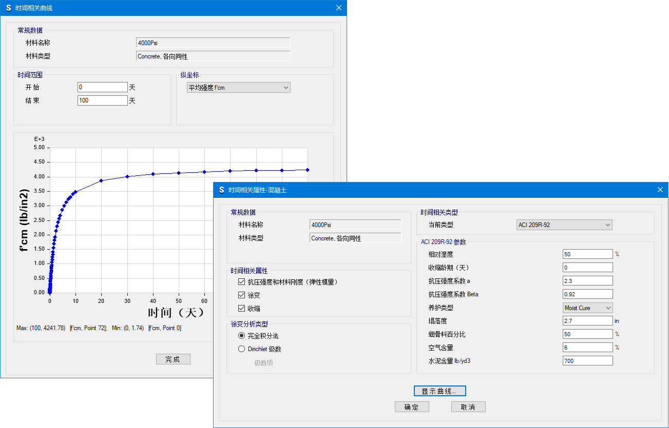 - 材料的定義包括徐變和收縮模型,可以用于長(zhǎng)期開裂變形分析。可以提供基于以下規(guī)范的模型:ACI 209R-92, AS 3600-2009, CEB-FIP 90, CEB-FIP 2010, Eurocode 2-2004, GL 2000, NZS 3101-2006