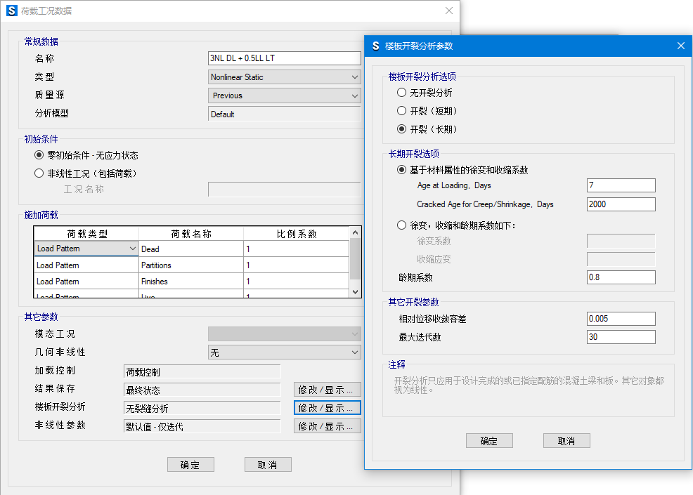 - 混凝土的長(zhǎng)期開裂分析可以指定加載時(shí)的齡期。程序默認(rèn)的加載時(shí)的齡期為7天