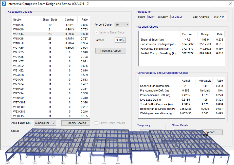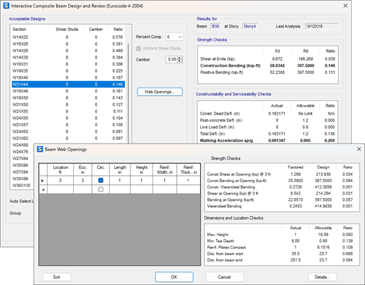 - 除了目前已有的混凝土板設(shè)計(jì),新增組合梁設(shè)計(jì)功能,這樣可以支持更多的樓板設(shè)計(jì)??梢岳L制和指定水平鋼梁進(jìn)行設(shè)計(jì)。可以對(duì)腹板開孔的梁進(jìn)行設(shè)計(jì),包括齒形梁和蜂窩梁。可以對(duì)整個(gè)模型進(jìn)行設(shè)計(jì),也可以交互式地對(duì)單一構(gòu)件進(jìn)行設(shè)計(jì)。支持的設(shè)計(jì)規(guī)范包括:AISC 360-16, AISC 360-10, AISC 360-05, BS5950-1990, Chinese 2010, CSA S16-14, and Eurocode 4-2004