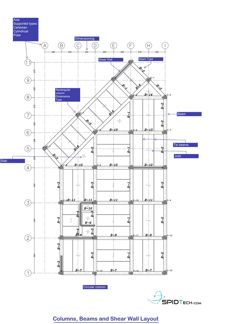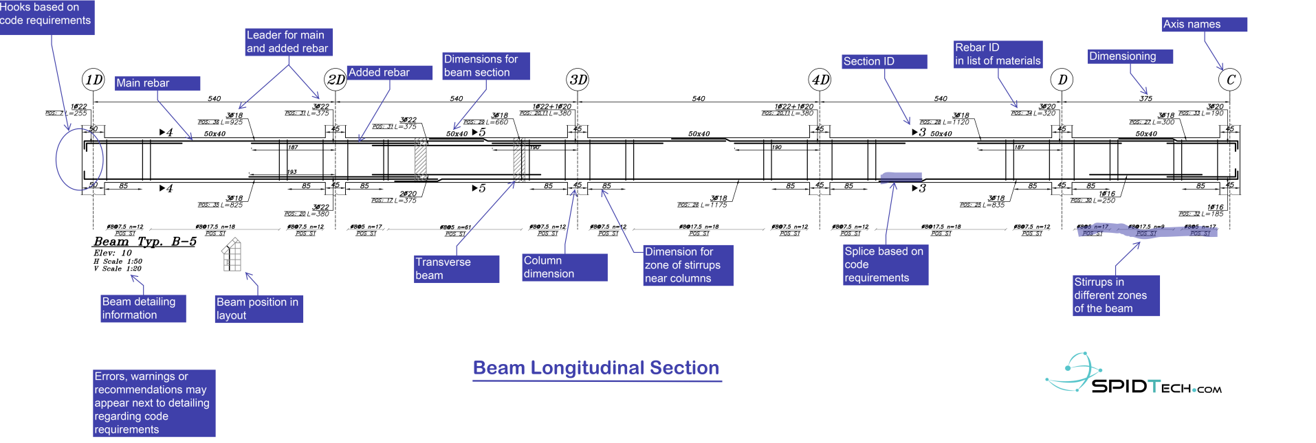 梁的縱斷面有重要的結構信息。包括主筋,附加鋼筋,梁不同區(qū)域的箍筋,橫截面,橫梁,柱和柱尺寸。此外,縱斷面包括基于規(guī)范要求的搭接,材料表中的鋼筋編號,尺寸和軸線,基于規(guī)范要求的彎鉤,梁定位布局,基于規(guī)范要求的警告和建議等等。