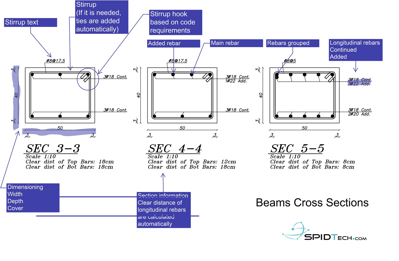 在梁縱斷面的任何位置可以繪制橫斷面線,這將為您提供該位置橫斷面的詳細信息。顯示主筋和附加鋼筋,箍筋和拉筋,基于規(guī)范要求的箍筋彎鉤以及箍筋文本。還包括梁截面的寬度,深度和保護層厚度,縱向鋼筋的凈距信息和鋼筋分組。