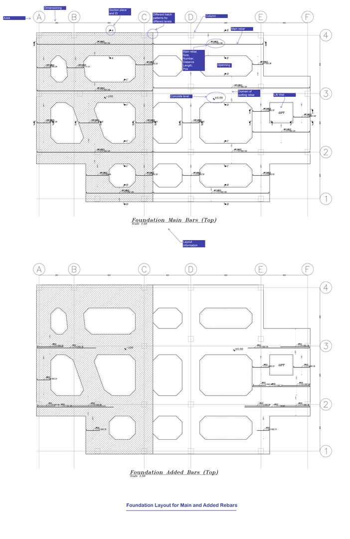 附加鋼筋基礎(chǔ)/樓板詳圖數(shù)據(jù)來自著名的CSI軟件,SAFE中文版 ?。根據(jù)用戶設(shè)置的基礎(chǔ)/樓板幾何形狀,詳細(xì)繪制加筋布置。在包含此類結(jié)構(gòu)數(shù)據(jù)的SPIDER布局中,您會(huì)看到A和B層附加鋼筋布置的區(qū)域和距離。這樣的布局包括尺寸標(biāo)注,軸線,橫截面符號以及型號,數(shù)量,距離,長度和材料ID列表。它還包括電梯井,混凝土等級,開洞,顯示不同標(biāo)高的不同填充圖案,柱和剪力墻符號,等等。