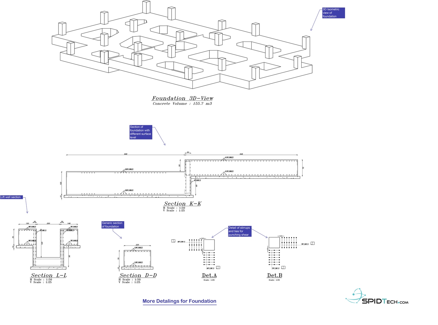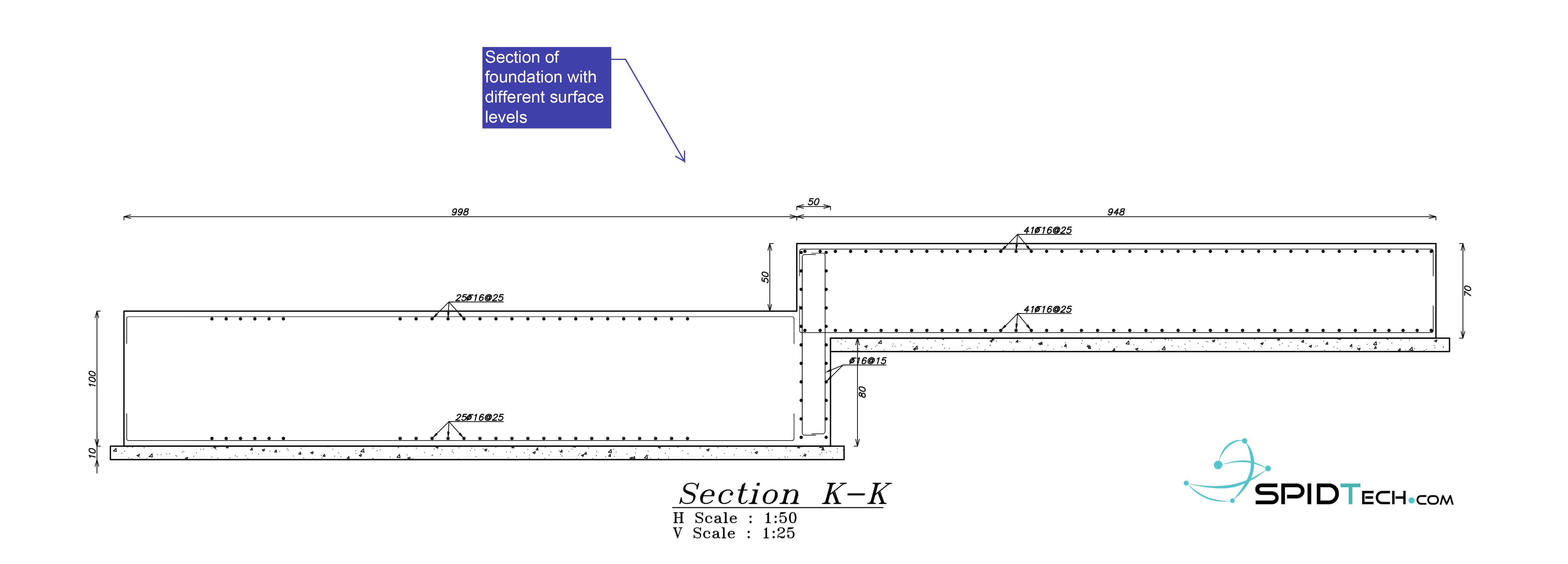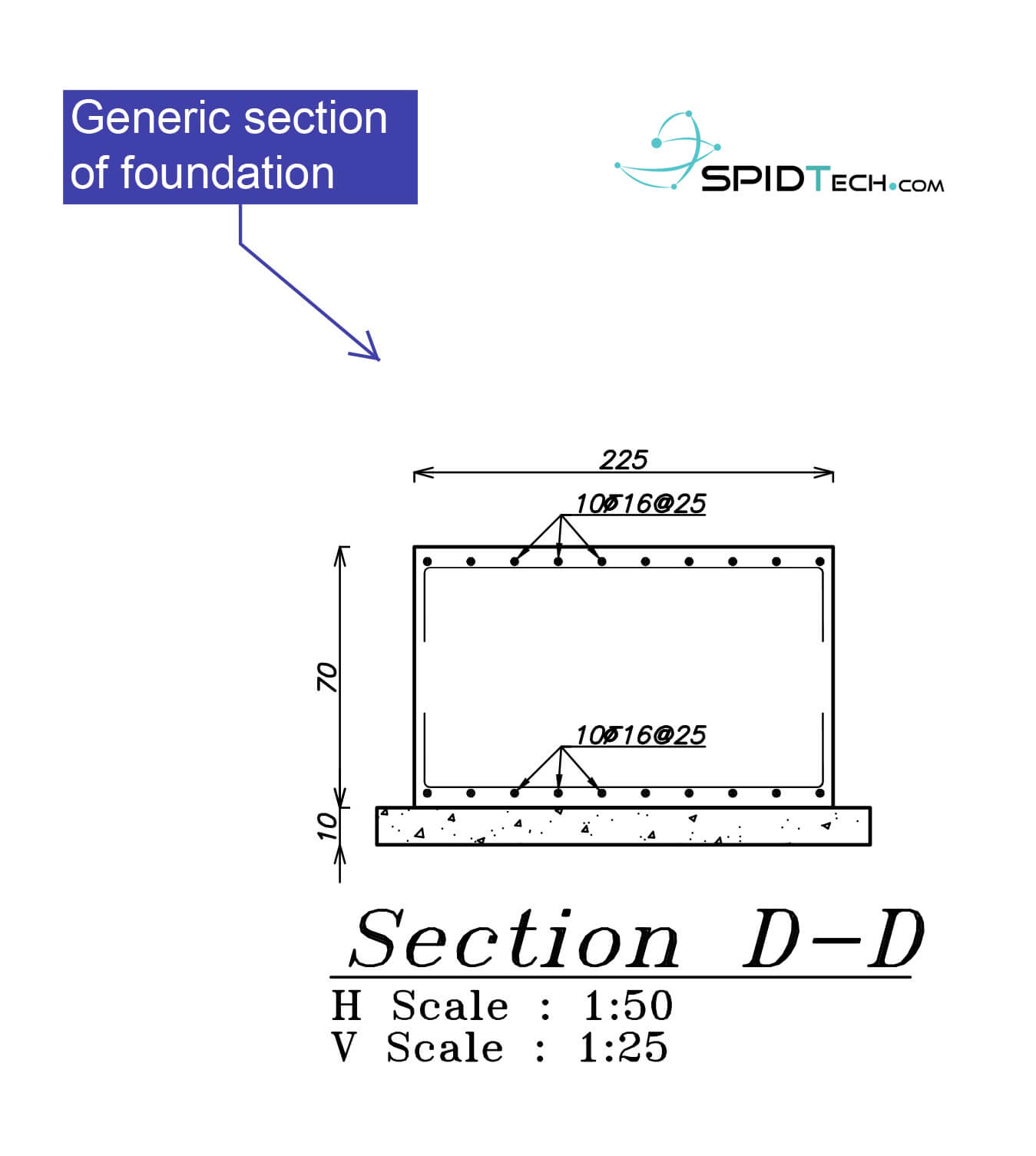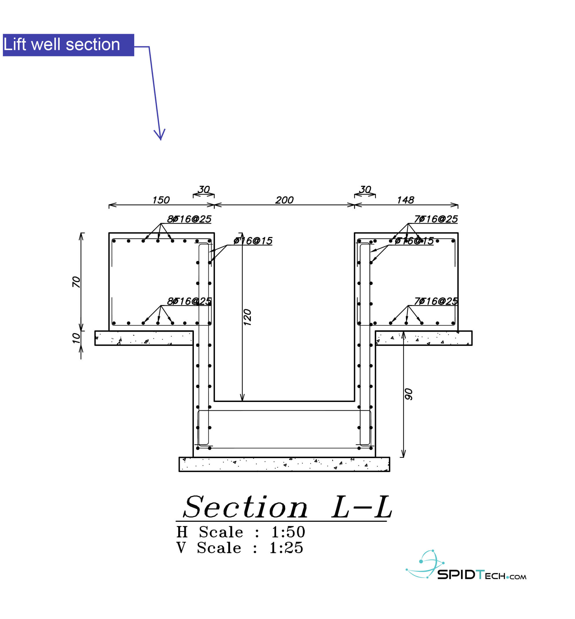 電梯井可在基礎(chǔ)布置中詳細(xì)說明。您也可以繪制井的橫截面。通過在布局平面的所需區(qū)域上繪制剖切線,您可以看到該部位的剖面圖。如果這條線切割到電梯井,則井壁和底部的配筋細(xì)節(jié)也將包括在內(nèi)。電梯井橫截面包括底部平板和井壁的水平和豎向鋼筋,混凝土等級,尺寸,混凝土厚度,比例尺,命名等。