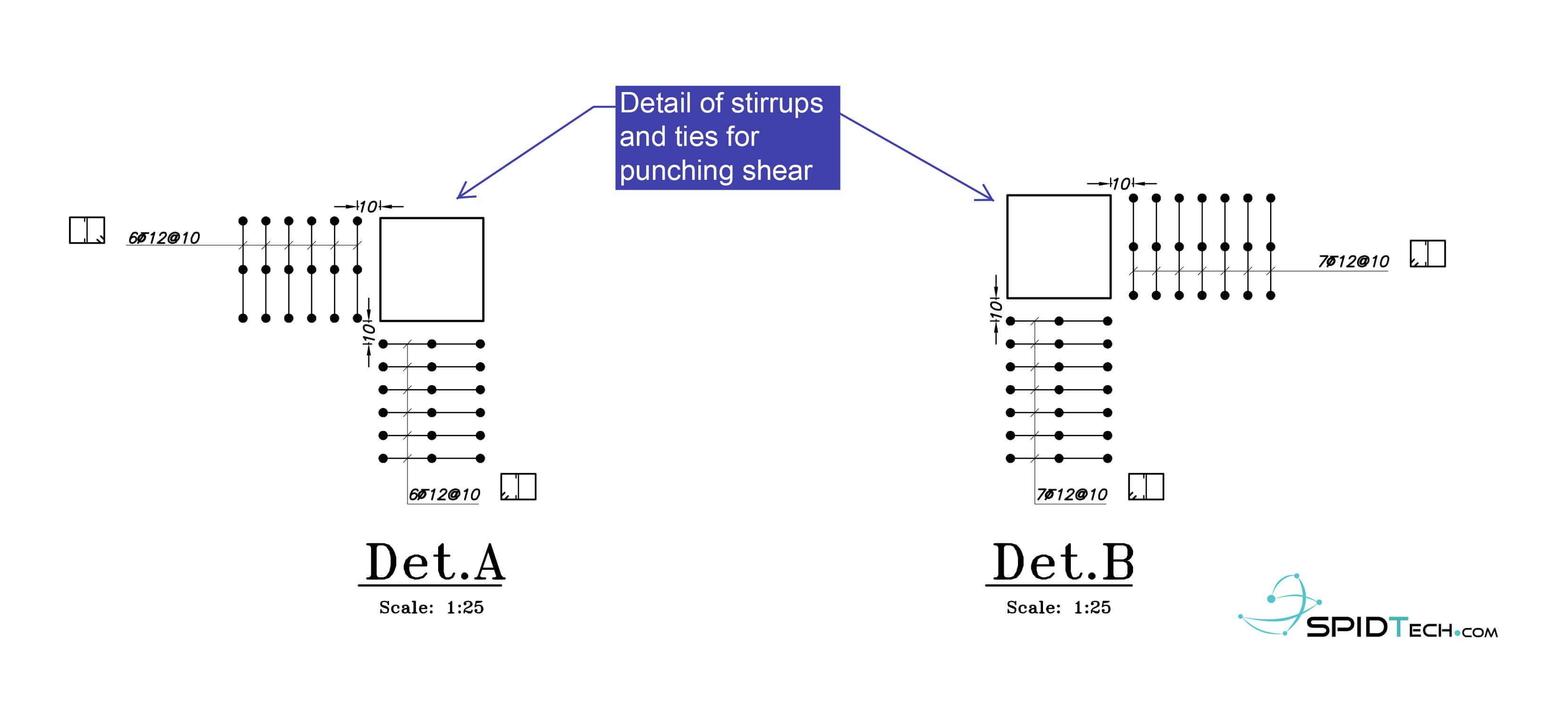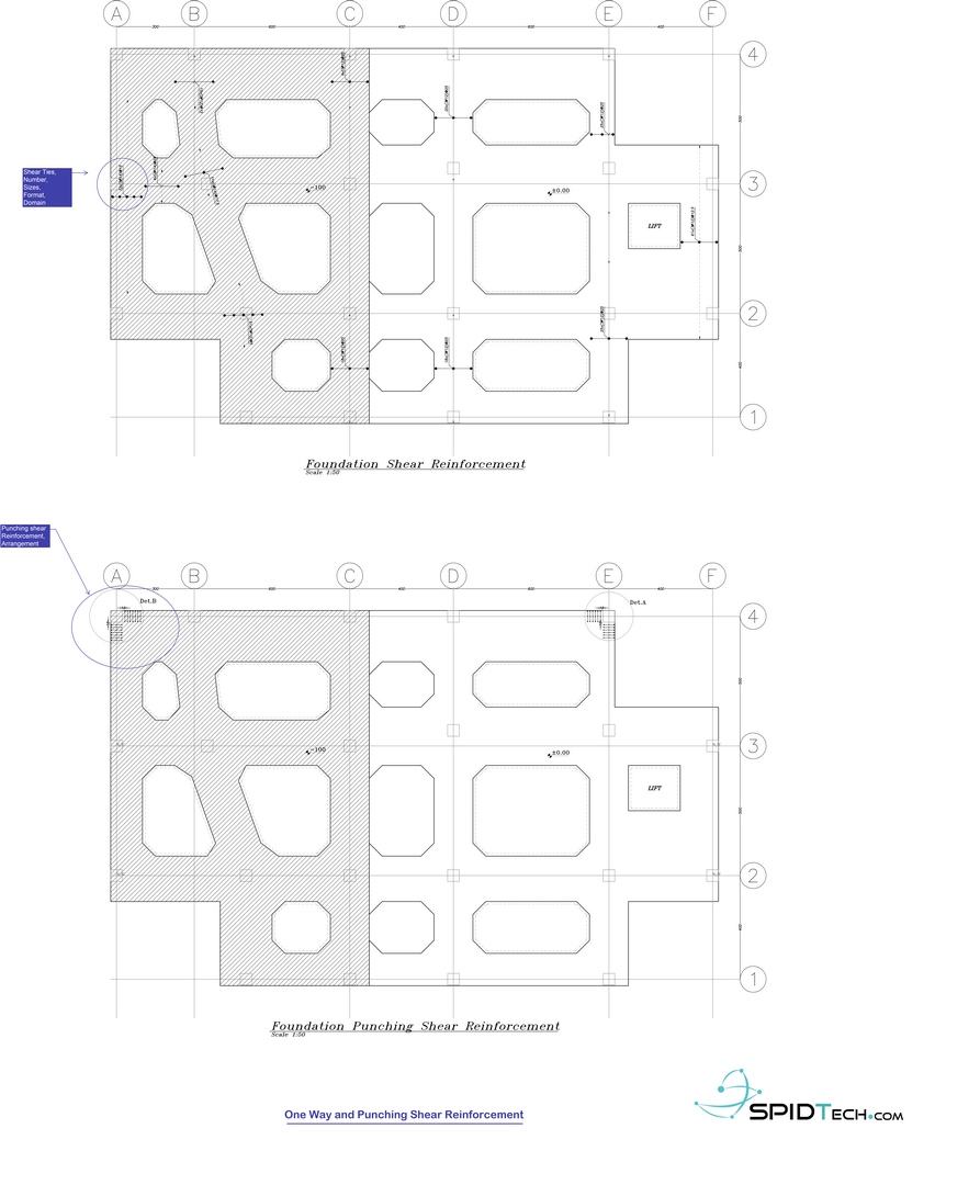 除了基礎(chǔ)和樓板中的主要鋼筋和附加鋼筋外,SPIDER還可以詳細(xì)描述單向抗剪鋼筋。SPIDER檢測需要針對單向剪切進(jìn)行配筋的區(qū)域,并計(jì)算所需的數(shù)量。單向抗剪鋼筋布局包括剪力鋼筋的布置、型號、區(qū)域、數(shù)量和形式。單向抗剪鋼筋按板帶寬度計(jì)算,詳見布置圖。所需的單向抗剪鋼筋面積來自SAFE中文版?的Av/s值。這些值是單向抗剪配筋的基礎(chǔ)。