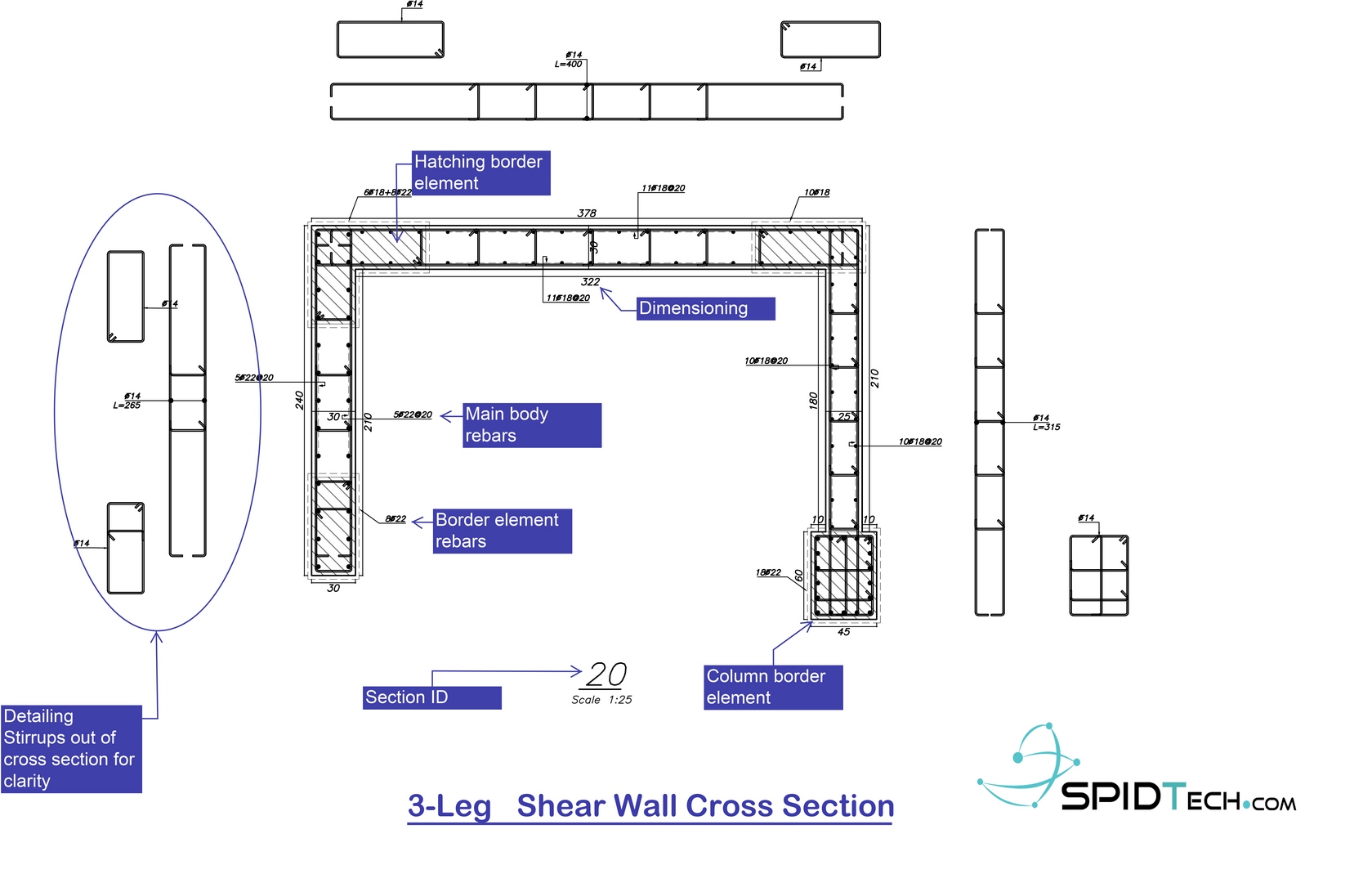 根據(jù)剪力墻立面的詳細信息,可以獲得墻任何位置的橫截面。這些截面顯示了墻的縱向和橫向鋼筋。在配筋方面,SPIDER截面也顯示了邊緣構(gòu)件的配筋。截面幾何、開洞、尺寸、保護層和比例是在剪力墻截面上顯示的其他結(jié)構(gòu)數(shù)據(jù)。此外,為了清楚起見,在橫截面之外詳細繪制了箍筋。
