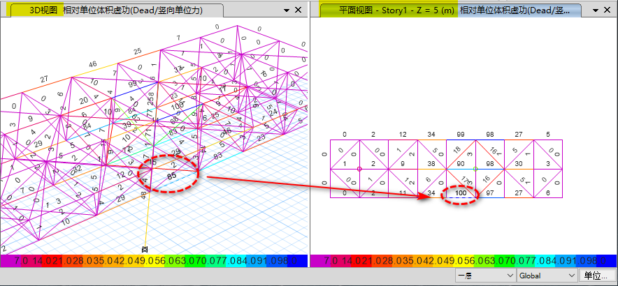 采用虛功圖查看對(duì)結(jié)構(gòu)某一特定變形影響最大的構(gòu)件時(shí),在3D 視圖和平面視圖中,同一個(gè)構(gòu)件其虛功值顯示不一致。如下圖中所選中的桿件,在左側(cè)3D視圖中其虛功值為85,而在右側(cè)平面視圖中其虛功值為100。