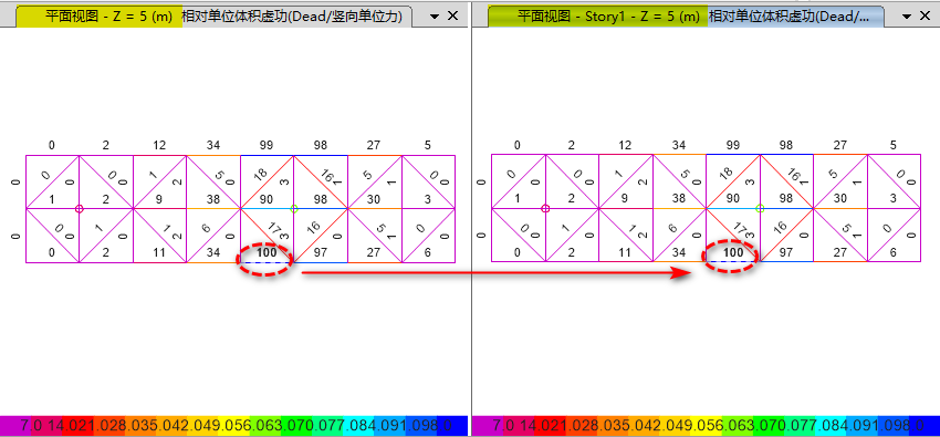 如上圖中所示,左側(cè)平面視圖中,該窗口僅能顯示當(dāng)前story1平面中的所有構(gòu)件,因此平面中的虛功值僅考慮了該平面中的所有構(gòu)件;而3D視圖中的虛功值是參考怎么個(gè)結(jié)構(gòu)計(jì)算的,所以兩者顯示虛功值不同。如果調(diào)整視圖,僅顯示結(jié)構(gòu)在z=5m位置處的所有構(gòu)件,其各個(gè)桿件的虛功值將一致,其結(jié)果如下圖所示。