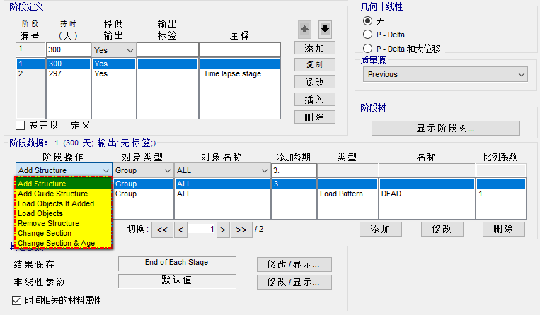 在SAP2000中定義階段施工時(shí),在【階段操作】中有多種階段操作,如下圖所示。這幾種操作的含義是什么?