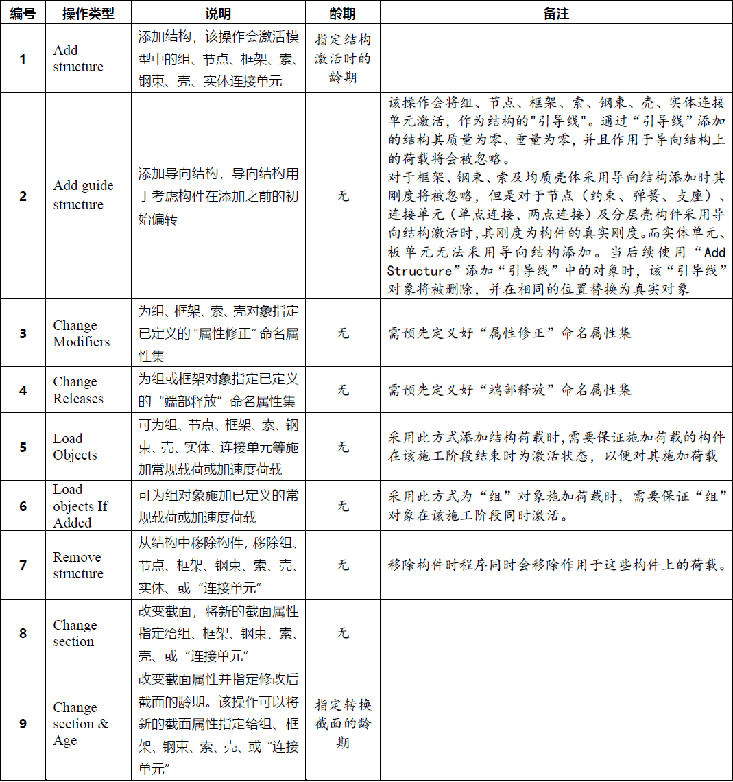 中階段施工分析用來(lái)模擬結(jié)構(gòu)在施工過(guò)程中結(jié)構(gòu)剛度、質(zhì)量、荷載等不斷變化的過(guò)程。程序中通過(guò)一個(gè)個(gè)施工階段來(lái)描述施工過(guò)程中結(jié)構(gòu)的變化。對(duì)于每一個(gè)施工階段,用戶需要指定哪些構(gòu)件需要添加、哪些荷載需要施加、哪些構(gòu)件需要?jiǎng)h除以及哪些構(gòu)件屬性發(fā)生轉(zhuǎn)變等。因此在在不同的施工階段需要采用不同的"階段操作"來(lái)描述該階段結(jié)構(gòu)的變化,程序中各個(gè)操作類型的含義如下表所示: