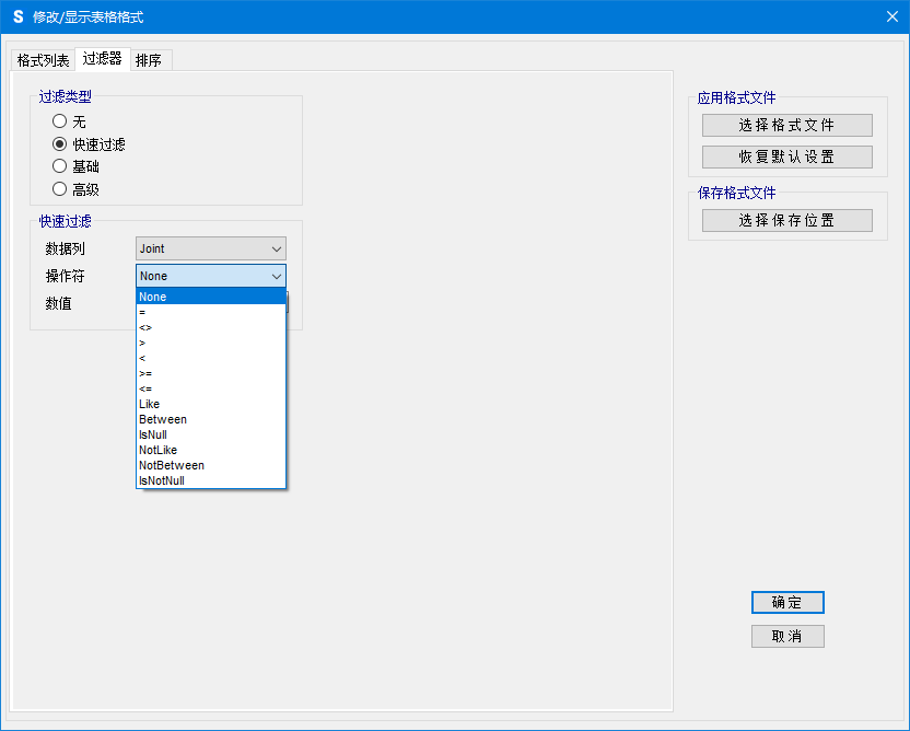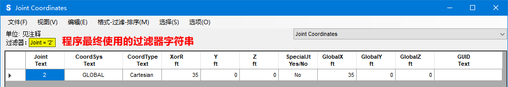 對于快速過濾和基礎過濾,程序收集用戶輸入的數(shù)據(jù)并使用這些數(shù)據(jù)來創(chuàng)建過濾器字符串。對于高級過濾,則是由用戶直接定義過濾器字符串(《使用SQL字符串應用高級過濾》)。無論應用哪種方式,表格里都會顯示程序最終使用的過濾器字符串。例如,使用“快速過濾”篩選節(jié)點標簽為2的行數(shù)據(jù),數(shù)據(jù)列選擇“Joint”,操作符選擇“=”,之后在數(shù)值一欄填入“2”,最終表格里顯示的過濾器字符串如圖2所示。
