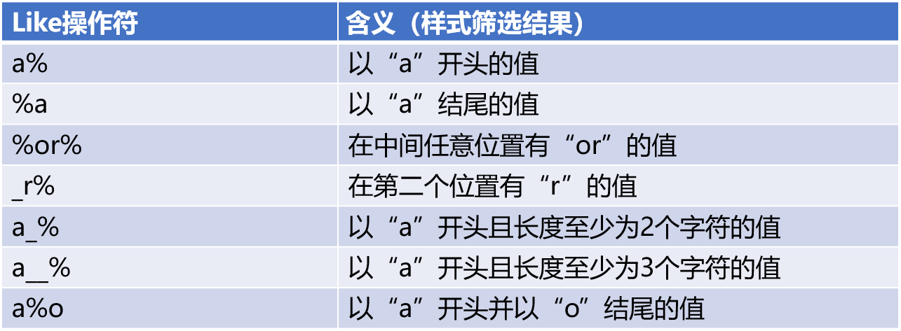 ③ 選擇“Like”操作符,用于篩選列中的指定樣式。數(shù)值一欄的輸入,需要配合SQL通配符使用,其中“%”代表零個或多個字符,“_”僅替代一個字符。下表中的示例,展示了帶有“%”和“_”通配符的Like操作符篩選的不同結果。