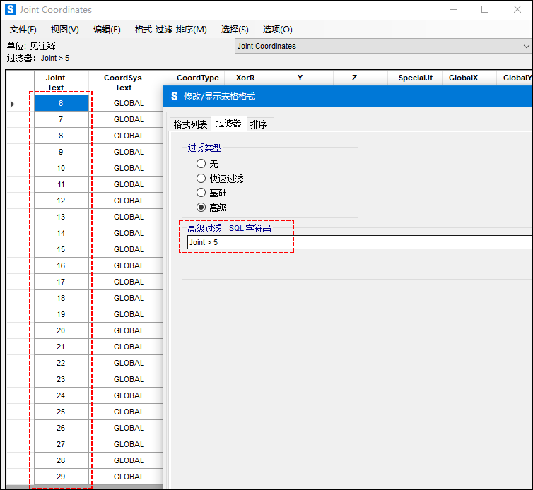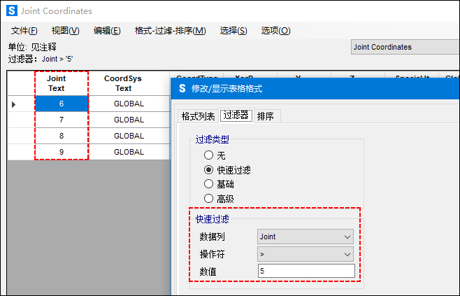 當(dāng)文本數(shù)據(jù)的數(shù)值均為數(shù)字時(shí),存在一種特殊情況:用戶可以在不使用單引號的情況下應(yīng)用高級過濾,程序?qū)⑵湟暈閿?shù)字?jǐn)?shù)據(jù)進(jìn)行排序和篩選。因此,對于問題描述中圖2的篩選結(jié)果,程序最終使用的過濾器字符串為:Joint > 5,數(shù)值5沒有括在單引號中,過濾結(jié)果與對數(shù)字?jǐn)?shù)據(jù)的篩選相同。但是需要注意的是,對于快速過濾和基礎(chǔ)過濾,程序始終將文本數(shù)據(jù)視為文本,也就是說,程序最終使用的過濾器字符串中始終包含單引號。