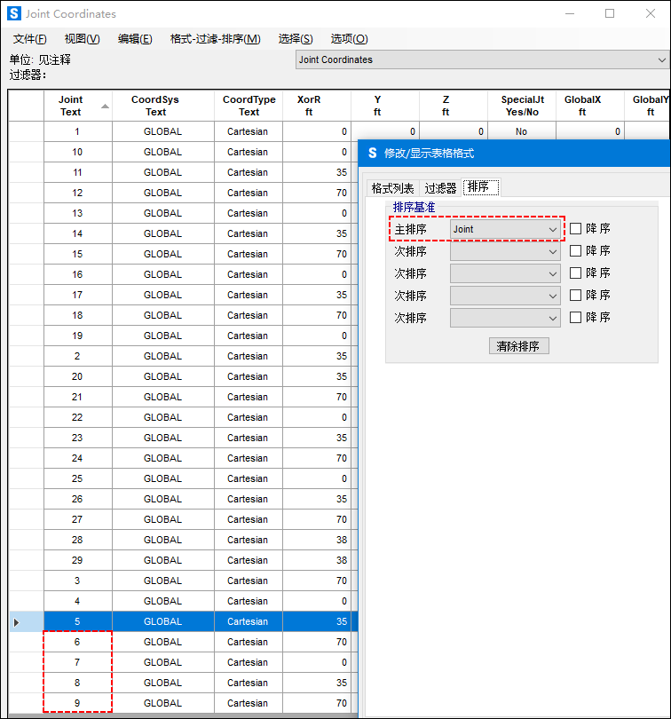 每個(gè)表格的數(shù)據(jù)列包含文本數(shù)據(jù)或數(shù)字?jǐn)?shù)據(jù),二者的排序方式是不同的:文本數(shù)據(jù)按字母順序排列,數(shù)字?jǐn)?shù)據(jù)按數(shù)字順序排列。假設(shè)數(shù)據(jù)列包含的數(shù)值是2、5和10。按文本排序(字母順序)會(huì)得到10、2、5,按數(shù)字排序會(huì)得到2、5、10。SAP2000中的“節(jié)點(diǎn)”屬于文本數(shù)據(jù),因?yàn)楣?jié)點(diǎn)標(biāo)簽實(shí)際上是文本,而不是數(shù)字;即使所有節(jié)點(diǎn)標(biāo)簽為數(shù)字也是如此。因此,當(dāng)對“節(jié)點(diǎn)”進(jìn)行排序或者使用“比較類”操作符(例如>或<)對其進(jìn)行篩選時(shí),程序?qū)⒒谧帜疙樞颍ǘ皇菙?shù)字順序)對其進(jìn)行排序或篩選。