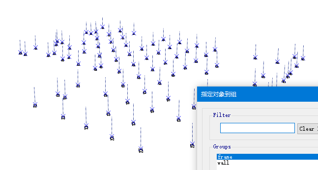如下圖所示,選中該層框架柱和柱底節(jié)點(diǎn),通過【指定】>【對象組】,將其指定到自定義的“frame”對象組中。同理,選中該層端柱、剪力墻和構(gòu)件底部節(jié)點(diǎn),指定后可以得到自定義的“wall”對象組。