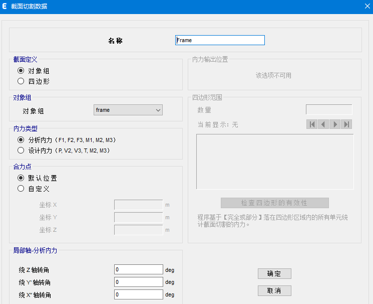 然后點(diǎn)擊【定義】>【截面切割】,基于對象組定義截面切割,合力點(diǎn)默認(rèn)為對象組中所有點(diǎn)對象的幾何中心,也可以勾選“自定義”,手動調(diào)整合力點(diǎn)坐標(biāo)。