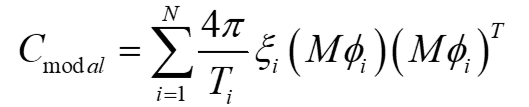 在 SAP2000 v21 和 ETABS v17 及之后的版本中,程序新添加了用于直接積分法的模態(tài)阻尼。如果在直接積分時(shí)程分析中需要考慮模態(tài)阻尼,那么在定義工況阻尼時(shí)需勾選“包含附加的模態(tài)阻尼”選項(xiàng),同時(shí)指定一個(gè)模態(tài)工況和相應(yīng)的模態(tài)阻尼比。注意,該模態(tài)工況的質(zhì)量源與直接積分時(shí)程分析的質(zhì)量源必須相同,模態(tài)工況的振型和周期將用于確定模態(tài)阻尼矩陣。直接積分時(shí)程分析中的模態(tài)阻尼并非我們通常使用的瑞利阻尼(比例阻尼),完整模態(tài)阻尼矩陣 Cmodal 為: