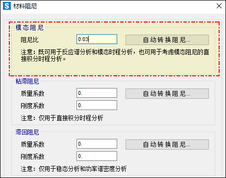 另外,需要注意的是,如果在定義材料時(shí)指定了材料的阻尼比,如下圖所示。程序?qū)⒆詣?dòng)將其轉(zhuǎn)換為復(fù)合模態(tài)阻尼,并添加到模態(tài)阻尼矩陣當(dāng)中,該阻尼忽略了模態(tài)間所有的交叉耦合。對(duì)于每個(gè)模態(tài),程序會(huì)自動(dòng)確保這兩個(gè)來源的模態(tài)阻尼比之和不超過 1。