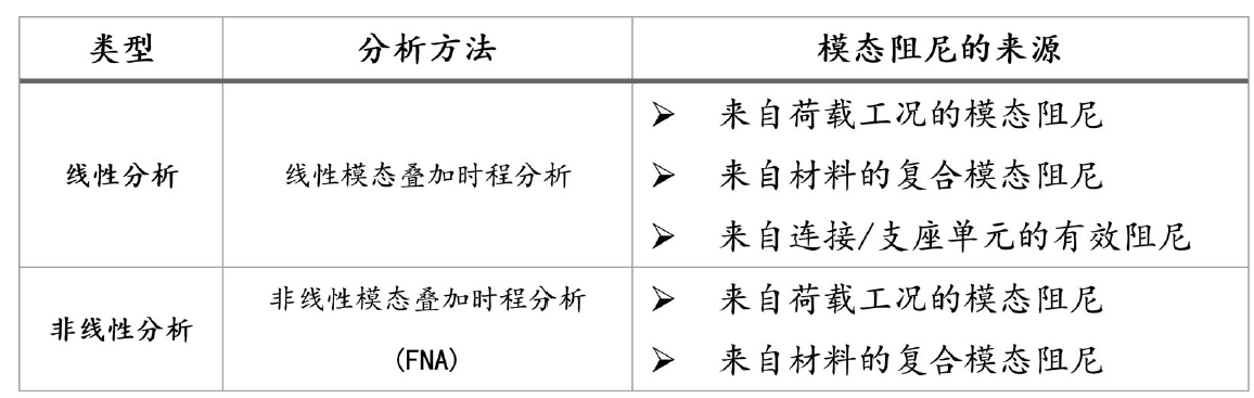 SAP2000/ETABS 中的模態(tài)疊加法是以結(jié)構(gòu)的模態(tài)分析結(jié)果為基礎(chǔ),通過結(jié)構(gòu)不同模態(tài)的疊加計(jì)算結(jié)構(gòu)總的響應(yīng)值。依據(jù)是否考慮非線性,可以將模態(tài)疊加法分為線性模態(tài)疊加時(shí)程分析和非線性模態(tài)疊加時(shí)程分析(即 FNA 法)。注意:非線性模態(tài)疊加時(shí)程分析(FNA)可以考慮連接單元的非線性,無法考慮幾何非線性和材料的非線性。這兩種分析方法均是通過模態(tài)阻尼來處理結(jié)構(gòu)的阻尼,但阻尼的來源略有不同,具體如下表所示: