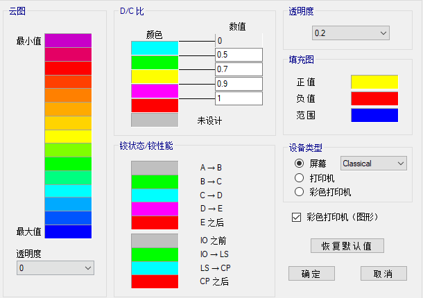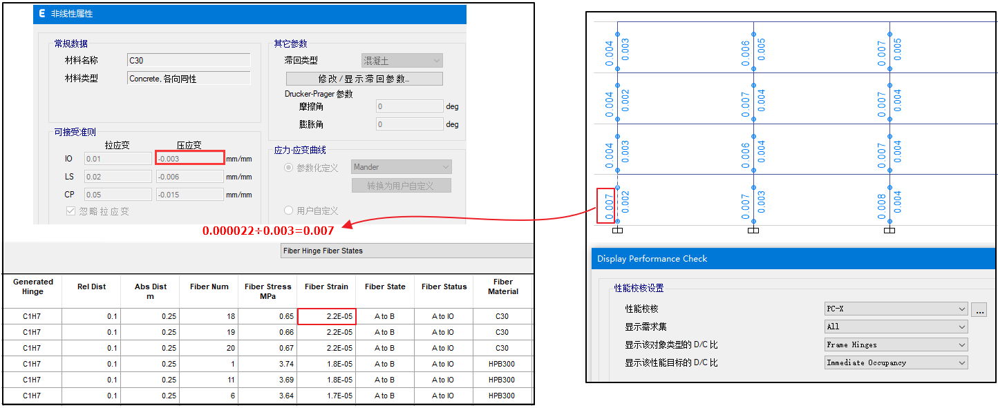 如下圖設置性能校核查看參數(shù),將在視圖窗口中顯示三條X向地震波的包絡結(jié)果,定量顯示框架鉸在IO狀態(tài)下的D/C比。比如,對于某框架柱的纖維鉸,將輸出纖維鉸中同一材料最大的纖維應變0.000022與所選性能目標應變值0.003的比值0.007。