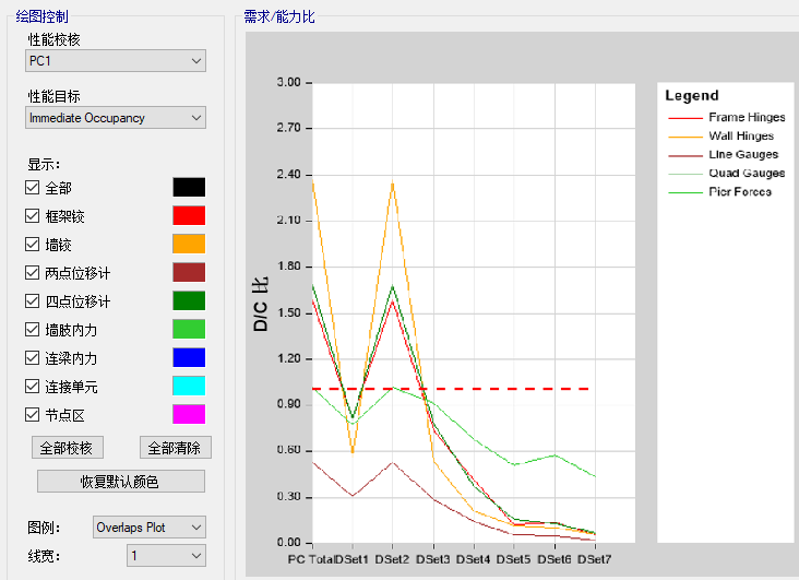 選擇需要查看的性能校核,設定性能目標,可以看到該性能校核中各需求集中各指標的最不利D/C比。比如下圖中紅線為各需求集中框架鉸的最大D/C比的連線,圖中水平紅色虛線為D/C比限值1。
